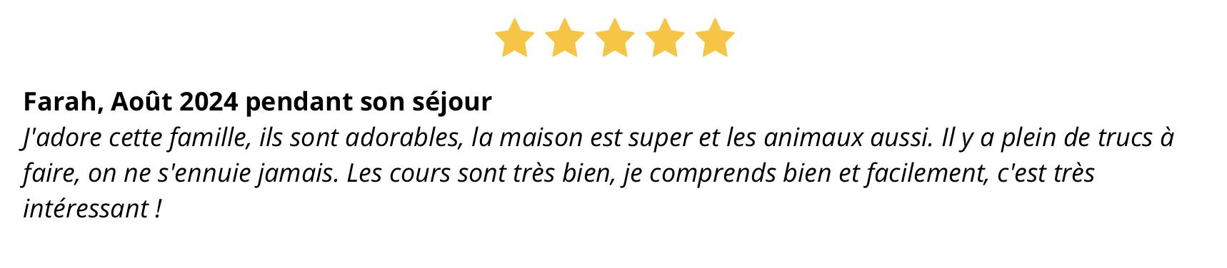 Une famille vraiment superbe et très sympa. Je me suis éclaté là-bas malgré qu’on ai pas pu faire beaucoup d’activités en raison du Covid. En tout cas, je reviendrai sans hésiter dans cette famille !!
