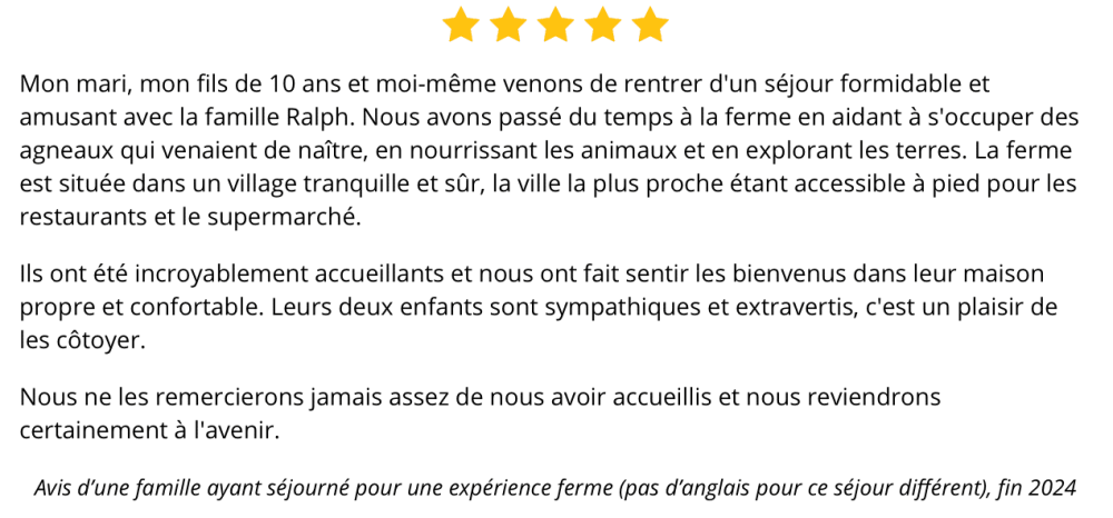 Mon fils de 13 ans a passé un excellent séjour. Il a été accueilli très gentiment et il a beaucoup apprécié la ferme « extraordinaire « de la famille Ralph. Je recommande sans reserve.