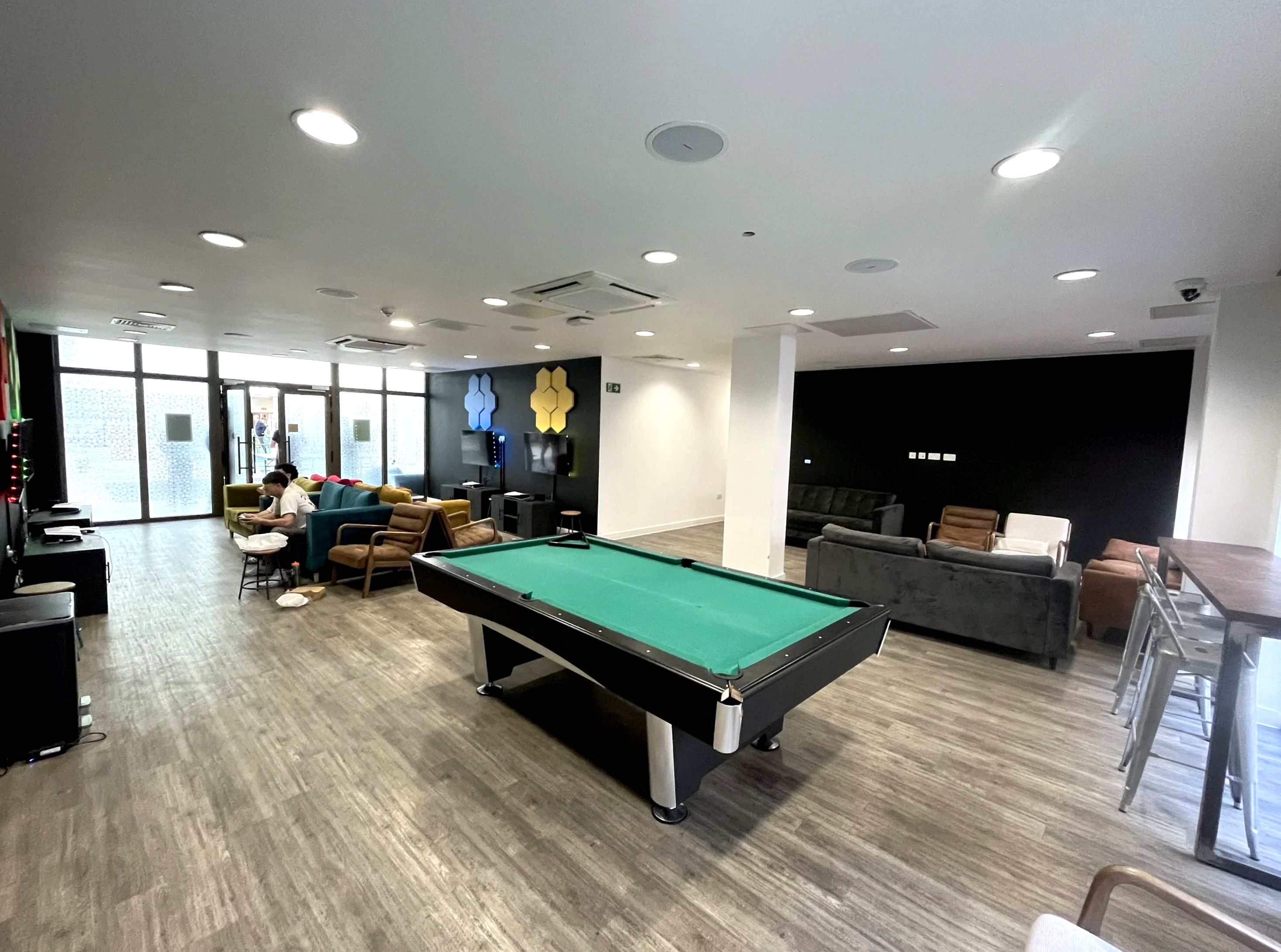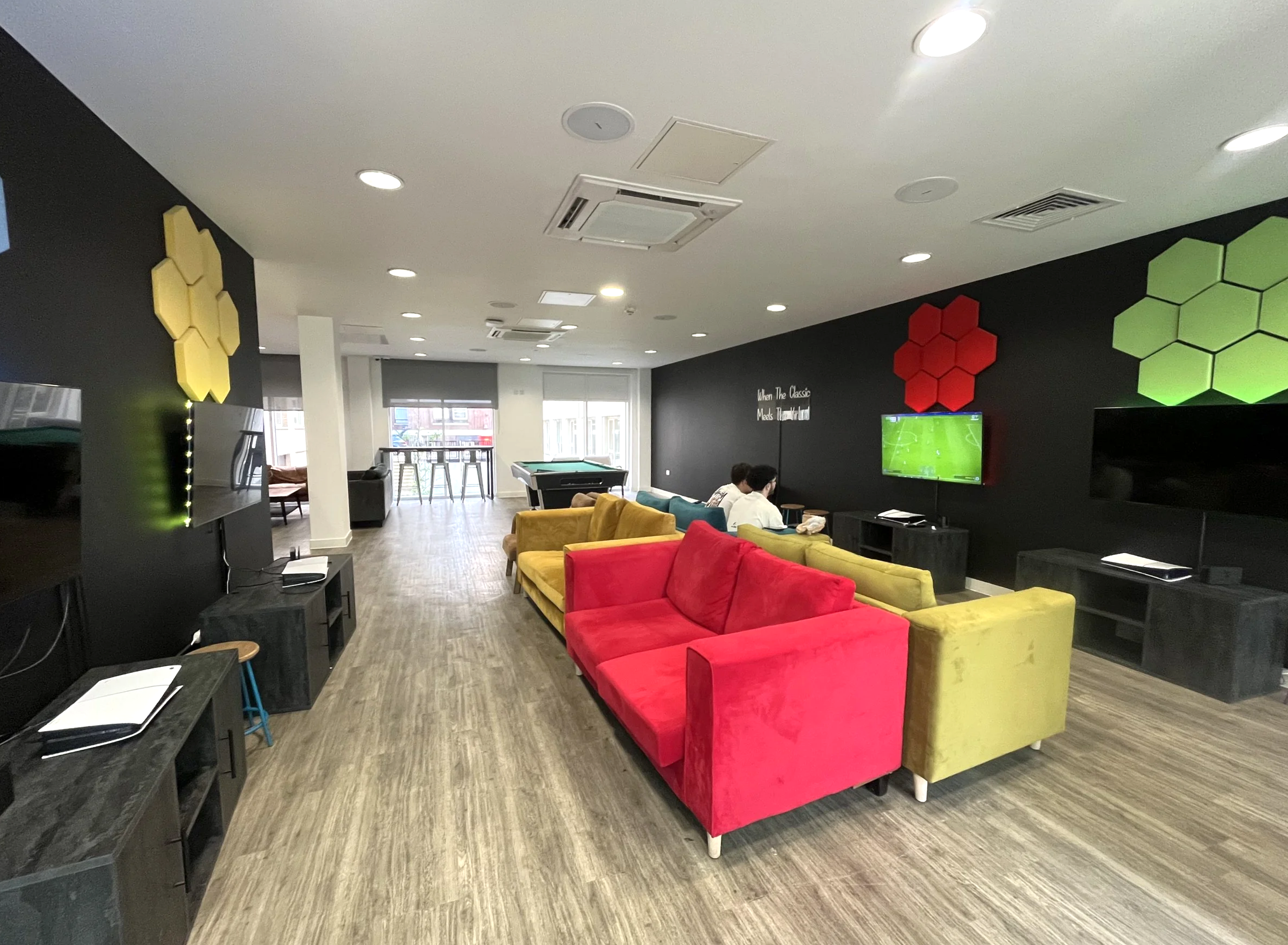 Les espaces communs, régulièrement nettoyés, comprennent des salons, des salles de détente et de socialisation ainsi qu’une salle de jeux ou un espace TV.