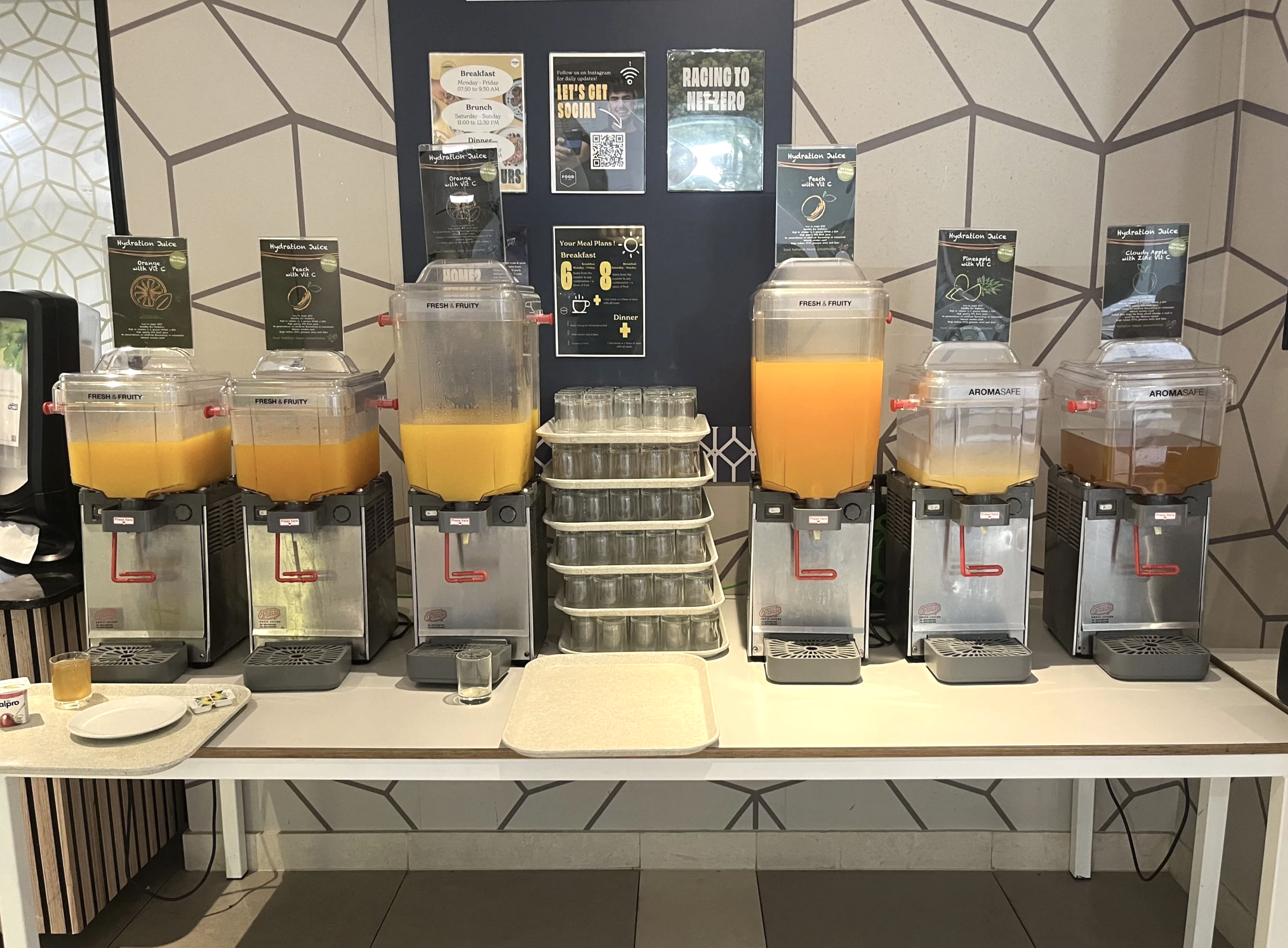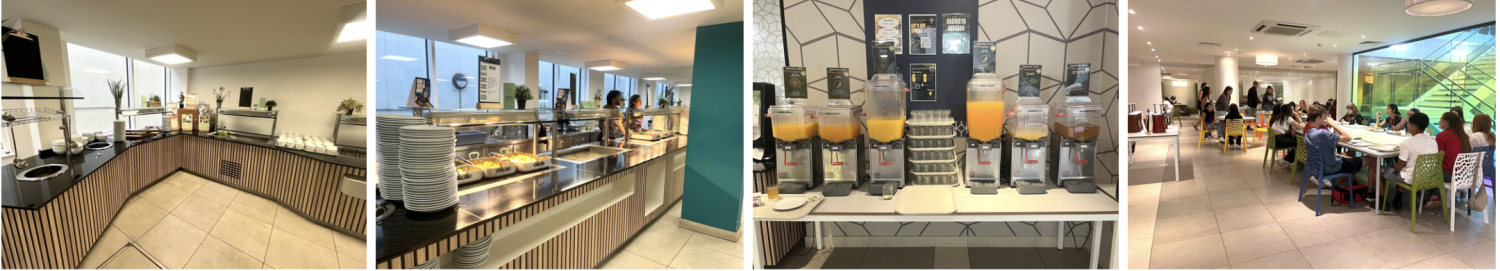 Chaque matin à partir de 7h30, les jeunes profitent d’un buffet en libre-service au Garden Halls : viennoiseries, croissants jambon-fromage, buns bacon-œuf, toasts, yaourts, céréales, fruits et jus.