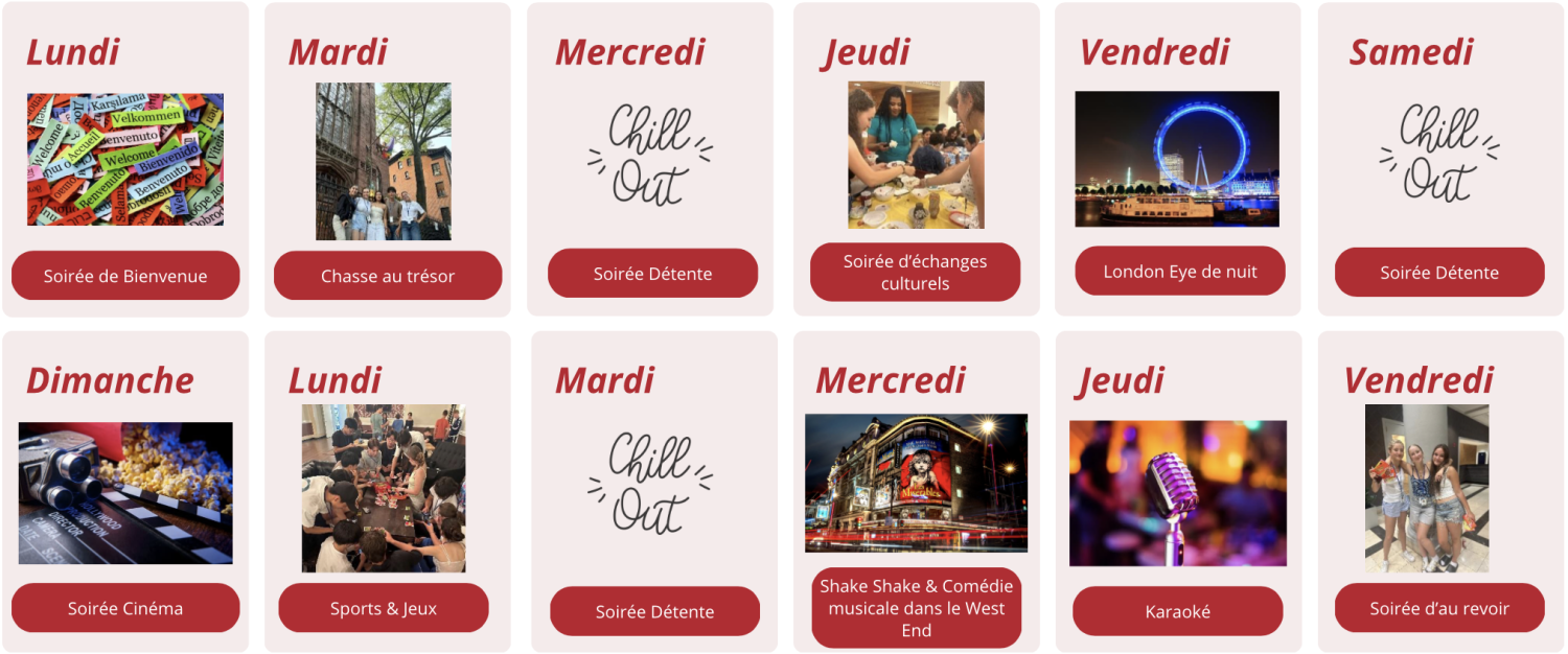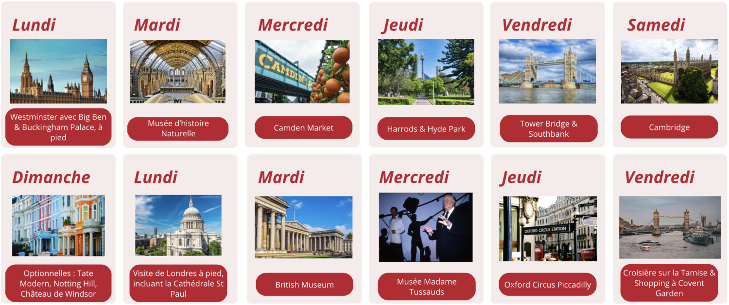 Le programme de 2 semaines comprend 10 excursions d’une demi-journée et une sortie d’une journée complète. Il permet de découvrir les lieux incontournables de Londres, de vivre des expériences authentiques et de partager des activités à la fois amusantes, sociales et éducatives. Les soirées organisées ajoutent une vraie ambiance d’été conviviale.