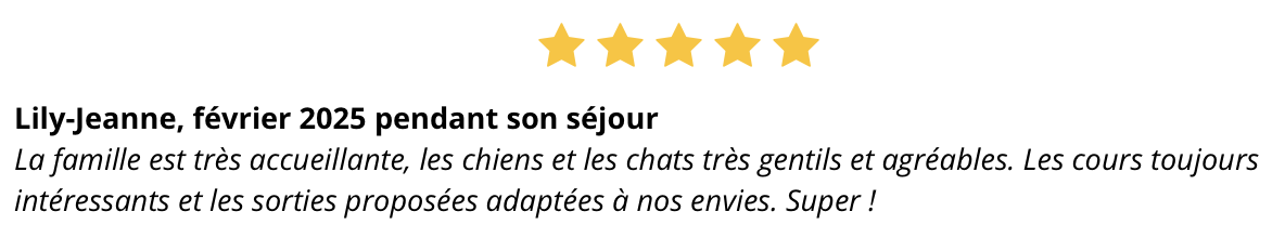Un second séjour pour notre fille qui est revenue ravie. Des activités ludiques, variées, nombreuses et de qualité, le tout dans un environnement chaleureux. La famille Allen est vraiment super ! Je sais déjà où ma fille voudra retourner !