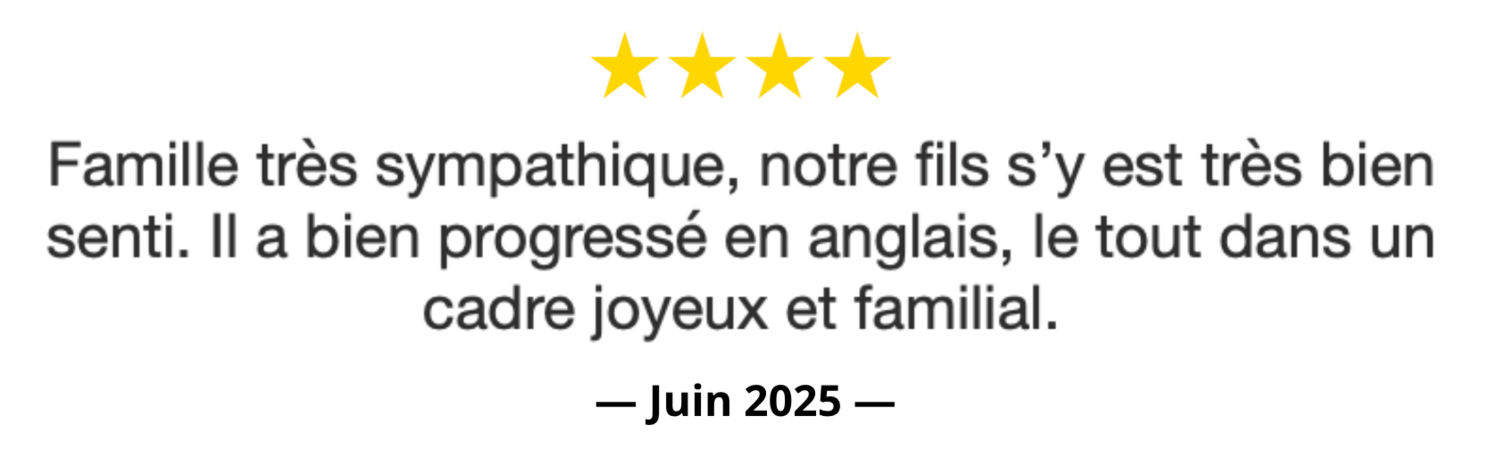 Famille accueillante, gentille, agréable, attachante et avec un bon sens de l'humour. Une fois arrivée je n'ai plus eu envie de repartir. Cours adaptés à chacun et motivants qui ont permis une amélioration de mon écrit. J'ai vu mon anglais s'améliorer à oral grâce aux multiples conversations que j'ai eu avec ma famille d'accueil. Les activités étaient variées et adaptées aux goûts des étudiants. Je recommande !!! Merci encore pour ce séjour incroyable !!!