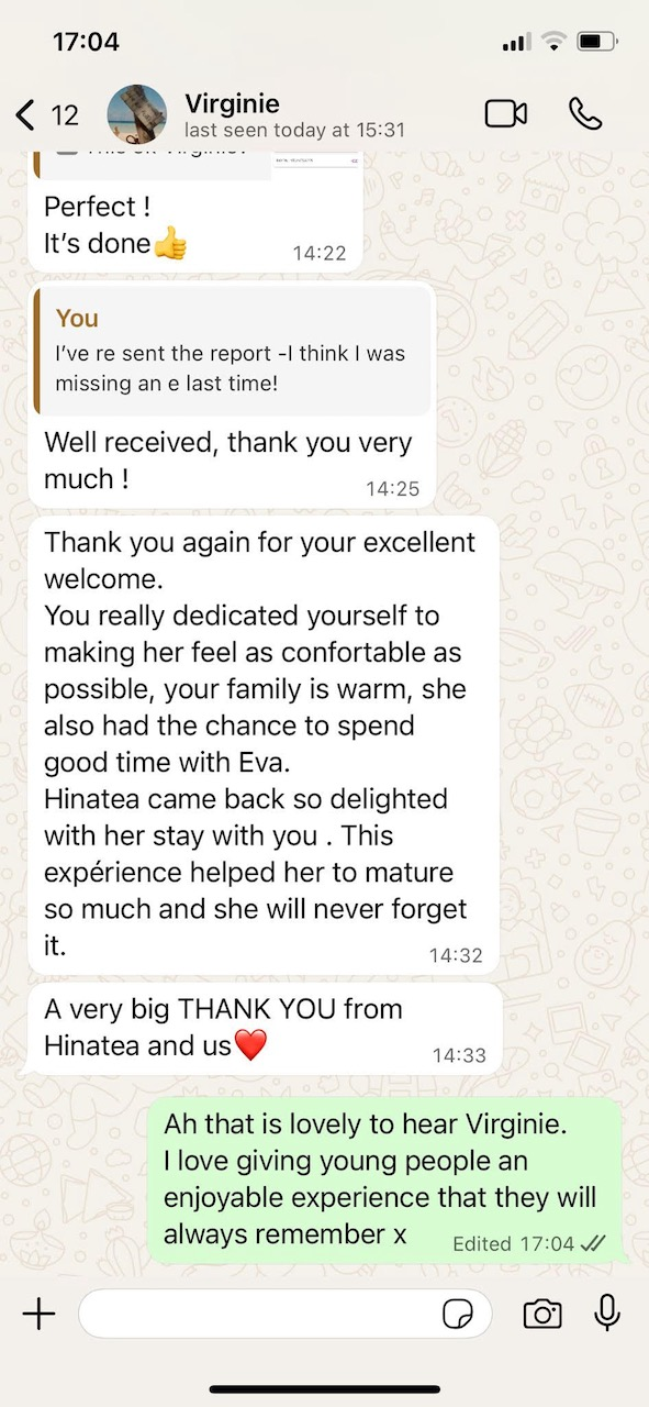 Famille au top, beaucoup de bienveillance, d'activités et de communication avec des photos pendant le séjour. Mon fils est revenu plus qu'enchanté, ne demandant qu'une seule chose ... y retourner !