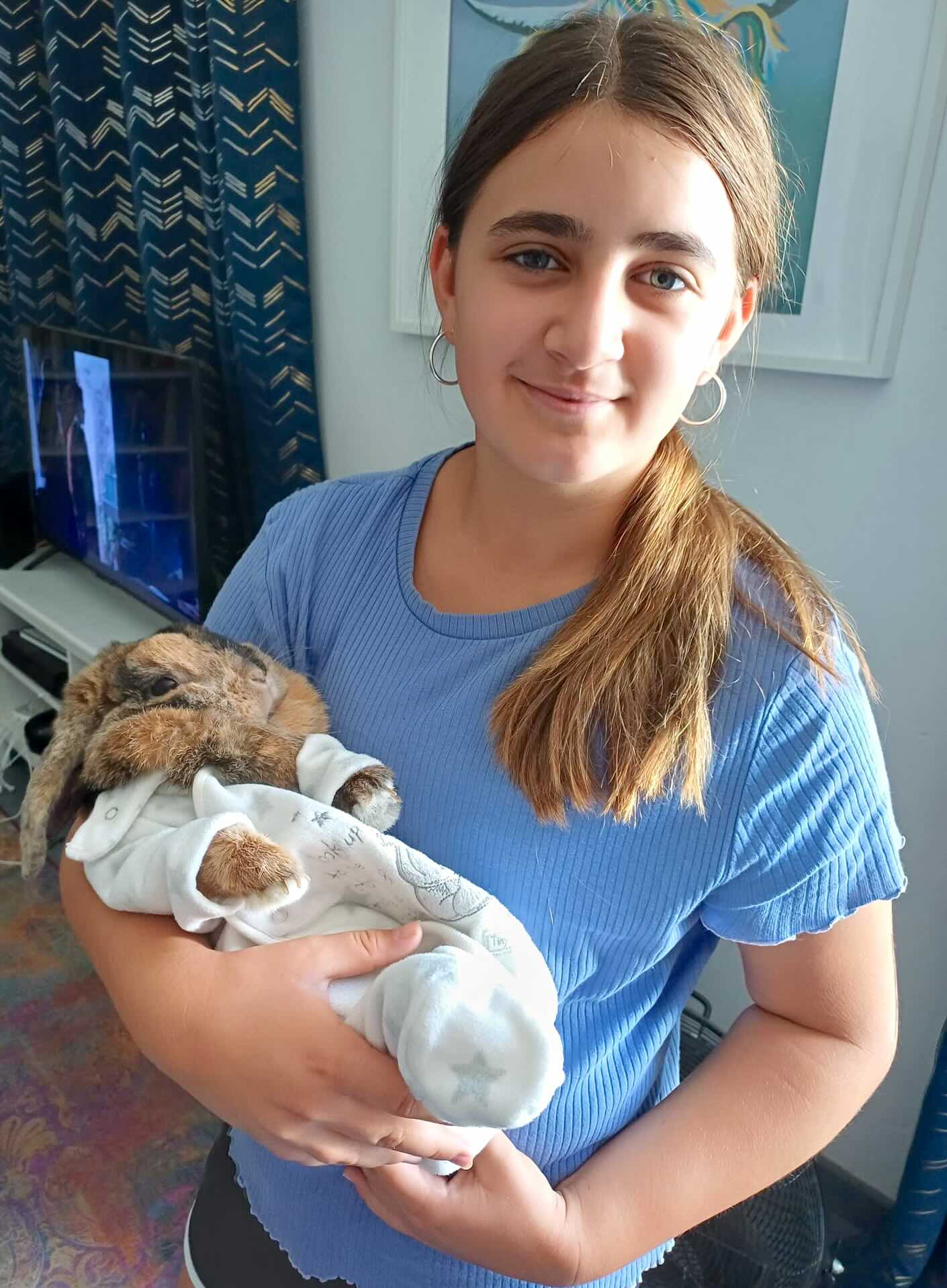 La famille partage sa maison avec trois chiens — Charlie (un caniche King Charles de 14 ans), Pepper (un labrador croisé de 9 ans, très câlin) et Jane (une chienne de 3 ans adoptée récemment, douce et calme) — ainsi qu’un lapin libre, Toffee, qui adore se promener dans la maison et participer à la vie de famille.