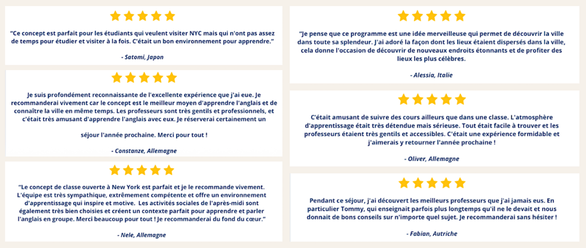 Au lieu de suivre des cours dans une salle de classe traditionnelle, les jeunes apprennent l’anglais de manière immersive dans des lieux emblématiques de New York. Les cours sont dynamiques, interactifs et ancrés dans la ville elle-même, afin de rendre l’apprentissage plus vivant, plus concret et plus motivant. Le site officiel met bien en avant un apprentissage en dehors du cadre traditionnel, dans des lieux iconiques, avec des thèmes liés à New York comme l’art, l’histoire, l’architecture ou l’immigration.