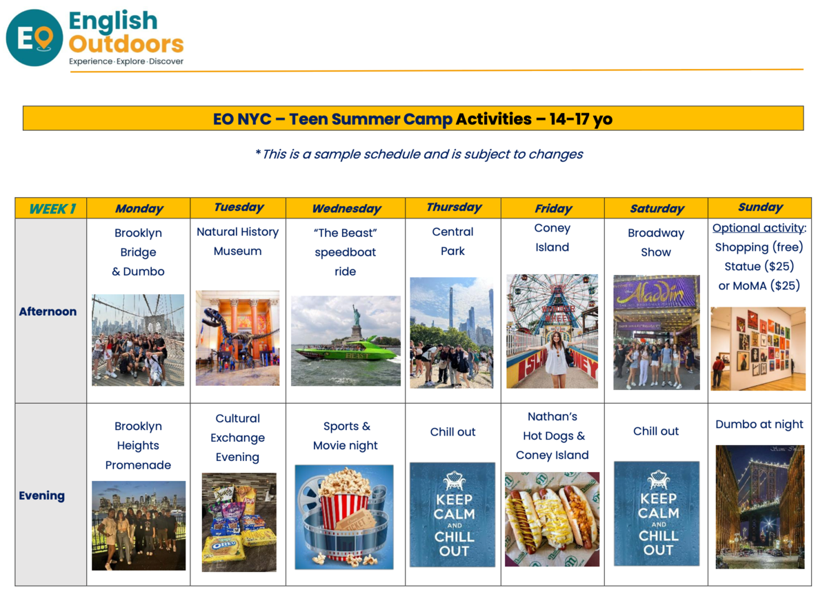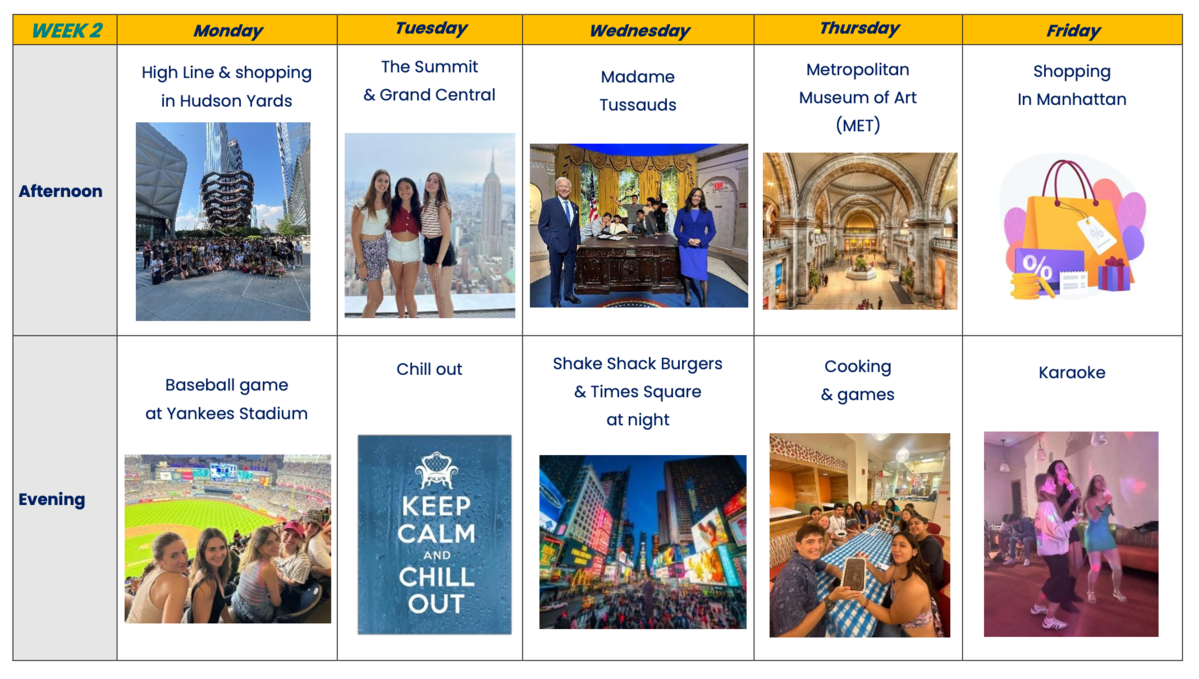 Le programme inclut 5 excursions de demi-journée et 1 aventure d’une journée complète chaque semaine, mêlant sorties éducatives et activités amusantes. Ce séjour offre le meilleur de New York, des expériences authentiques, une immersion dans l’ambiance estivale de la ville et des activités diversifiées.