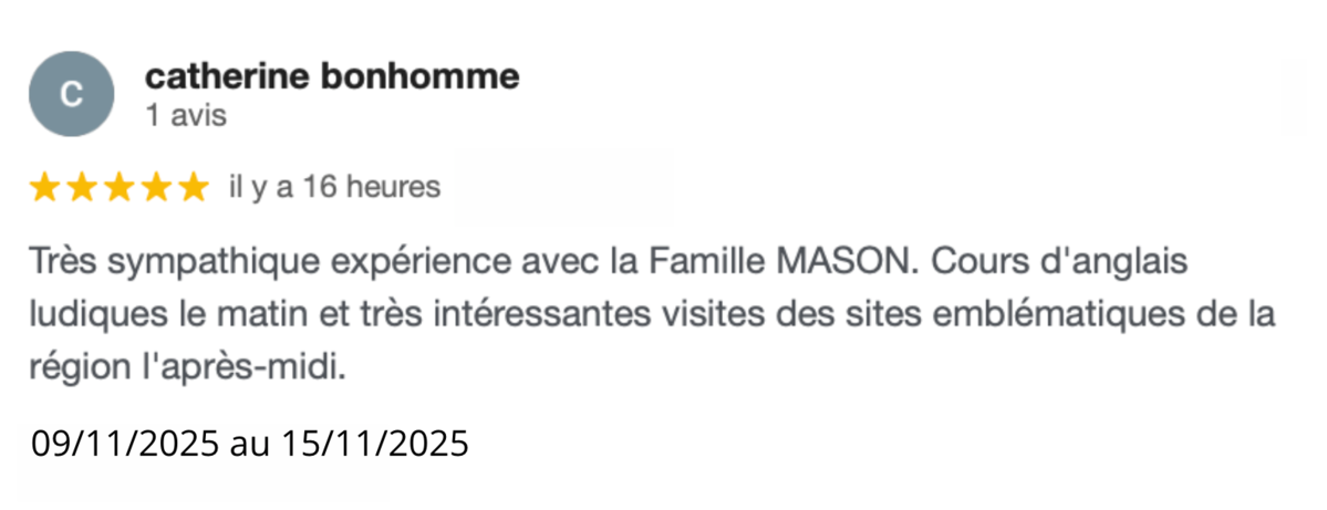 La famille Mason a été particulièrement attentive et a l'écoute pour ce tout premier séjour hors de sa propre famille et dans un environnement anglophone pour mon fils de 11ans. Merci beaucoup