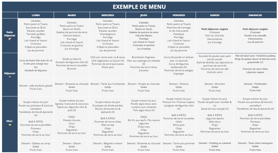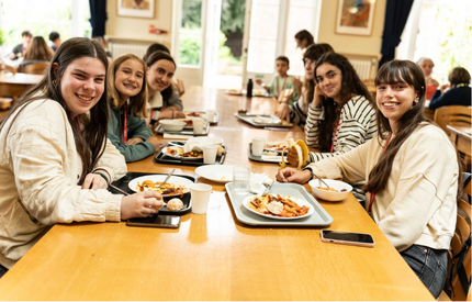 Le séjour comprend la pension complète, avec petits-déjeuners, déjeuners, dîners et en-cas pris dans la salle à manger de l’école.