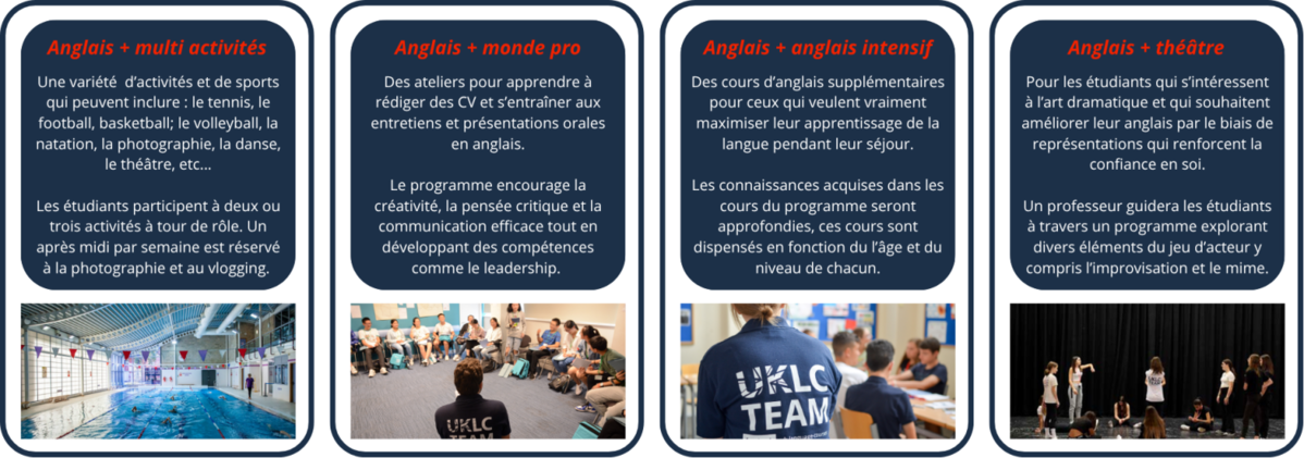 Chaque semaine, les étudiants participent à 9 heures d’activités sportives, artistiques et ludiques en anglais. Ils choisissent un programme d’activités parmi quatre options proposées, qu’ils suivent tout au long du séjour.
