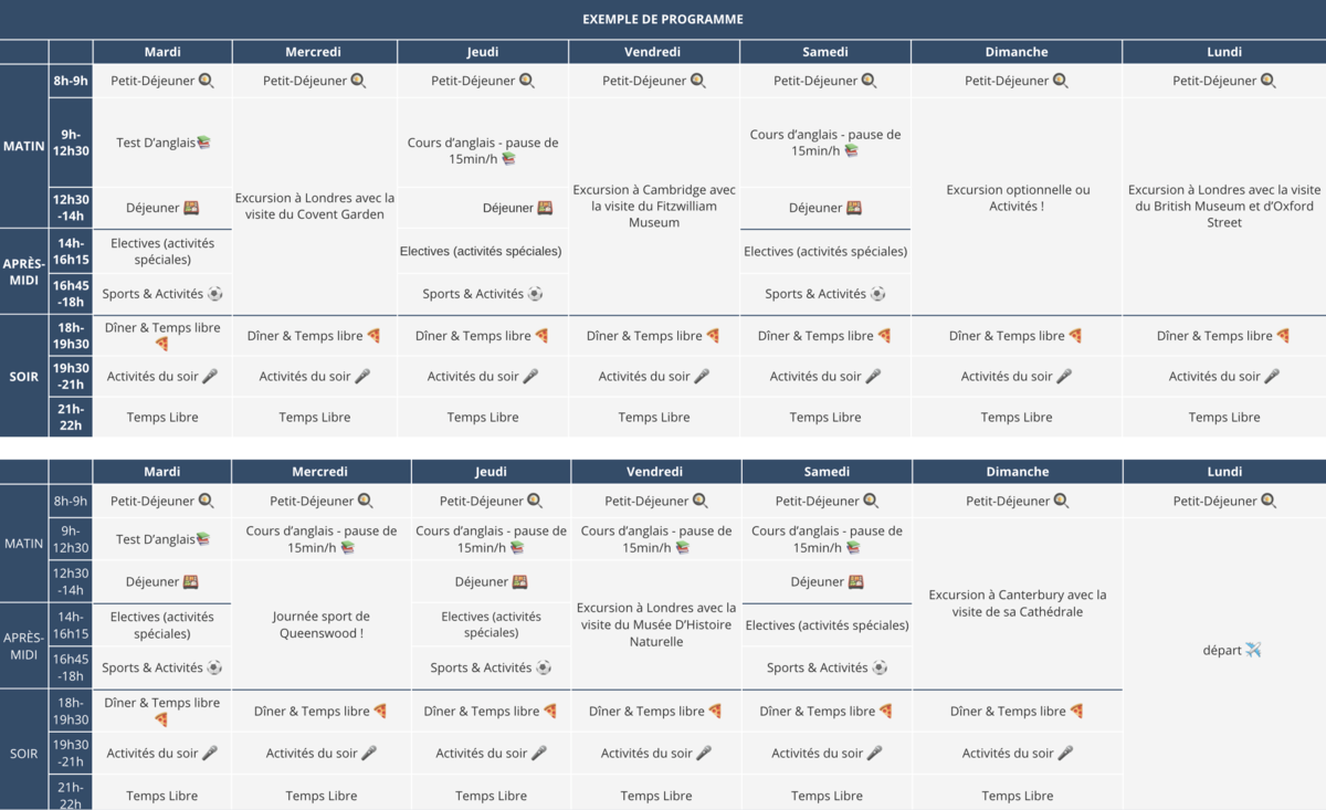 (L’emploi du temps détaillé est communiqué sur place et peut varier selon les activités et excursions.)