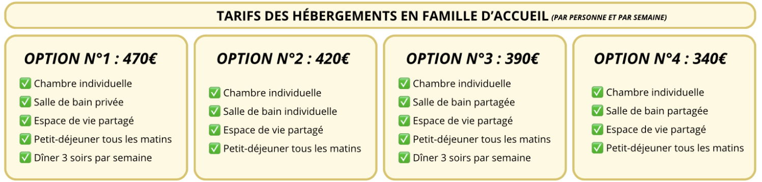 Le tarif mis en ligne ne comprend pas le logement, mais seulement les cours. Pour être logé, plusieurs possibilités s'offrent à vous : en famille d'accueil ou en hotel/appartament/maison d'hôtes.