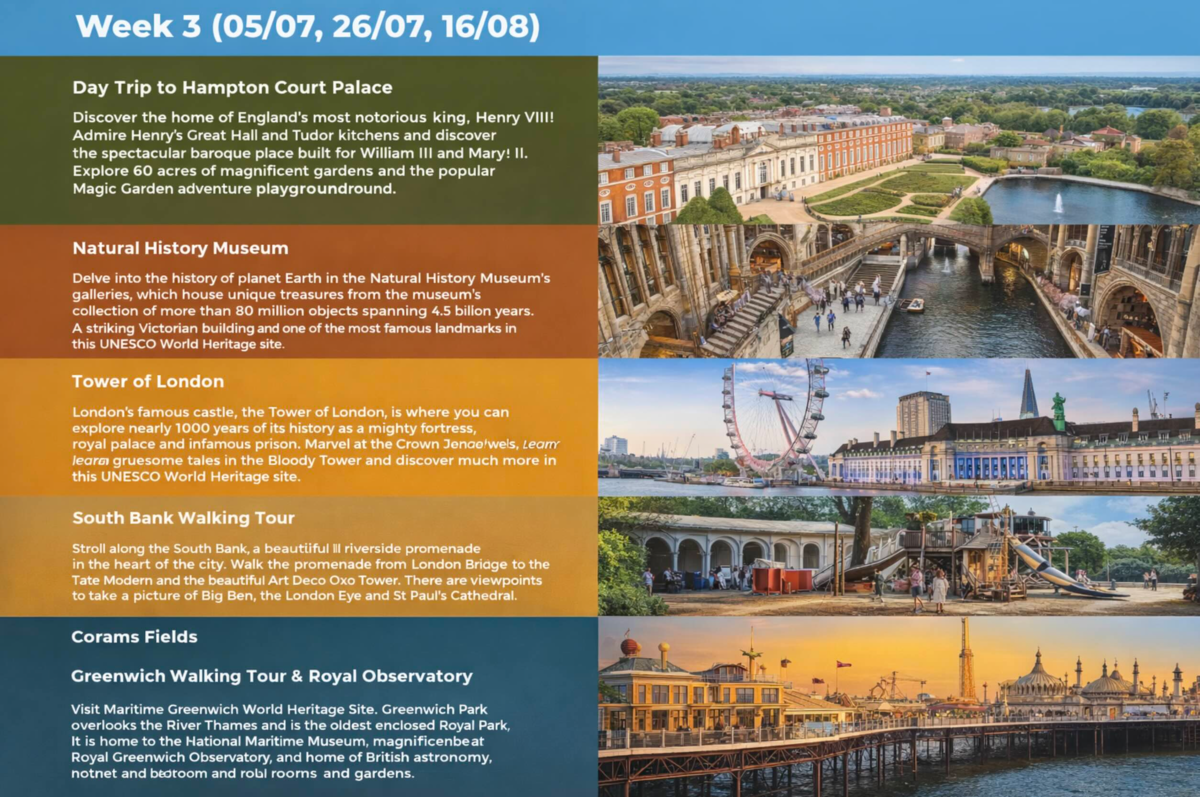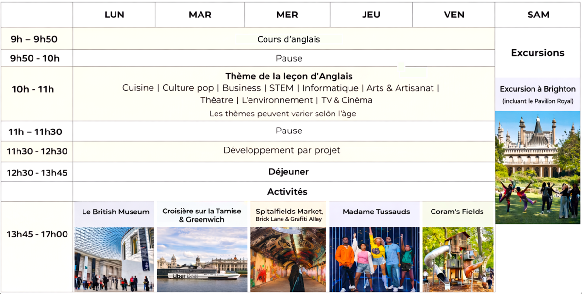 Chaque après-midi et le samedi, les jeunes découvrent Londres à travers un programme varié : visites, balades, musées, parcs et quartiers emblématiques.