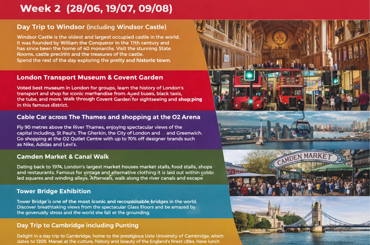 🎭 Activités : programme social proposé par l’école (visites culturelles, balades dans Londres, musées, sorties conviviales – certaines activités gratuites, d’autres en supplément)