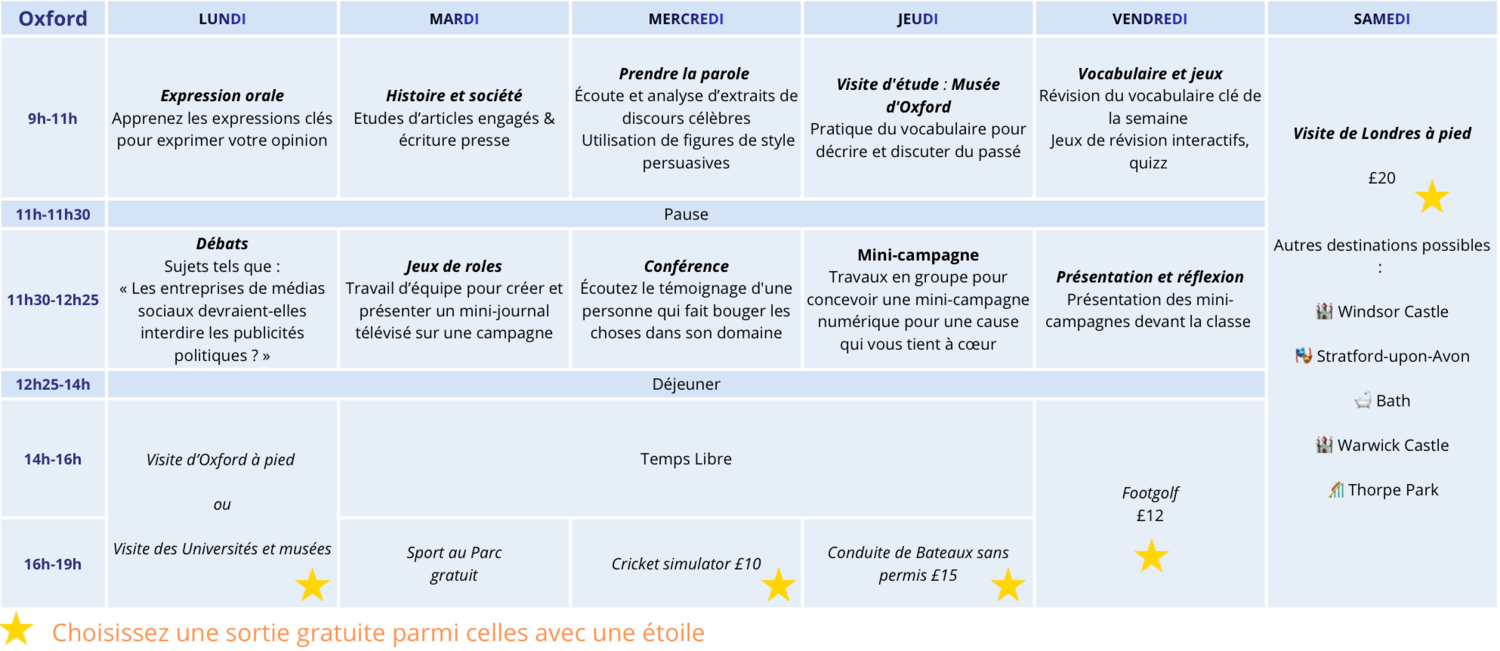 🚌 Excursions : 1 excursion incluse / semaine + study visits