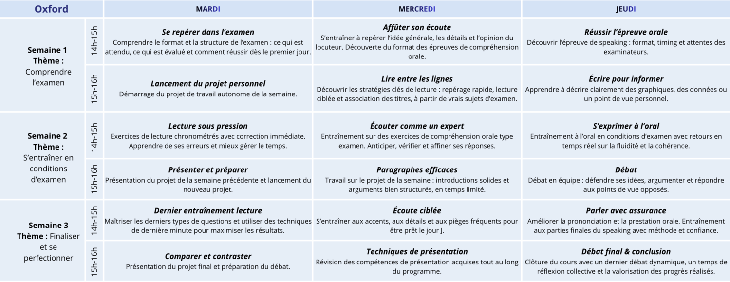 Le programme comprend 21 leçons par semaine, réparties du lundi au vendredi, combinant cours généraux, préparation aux examens et entraînement intensif à l’oral et à l’écrit.