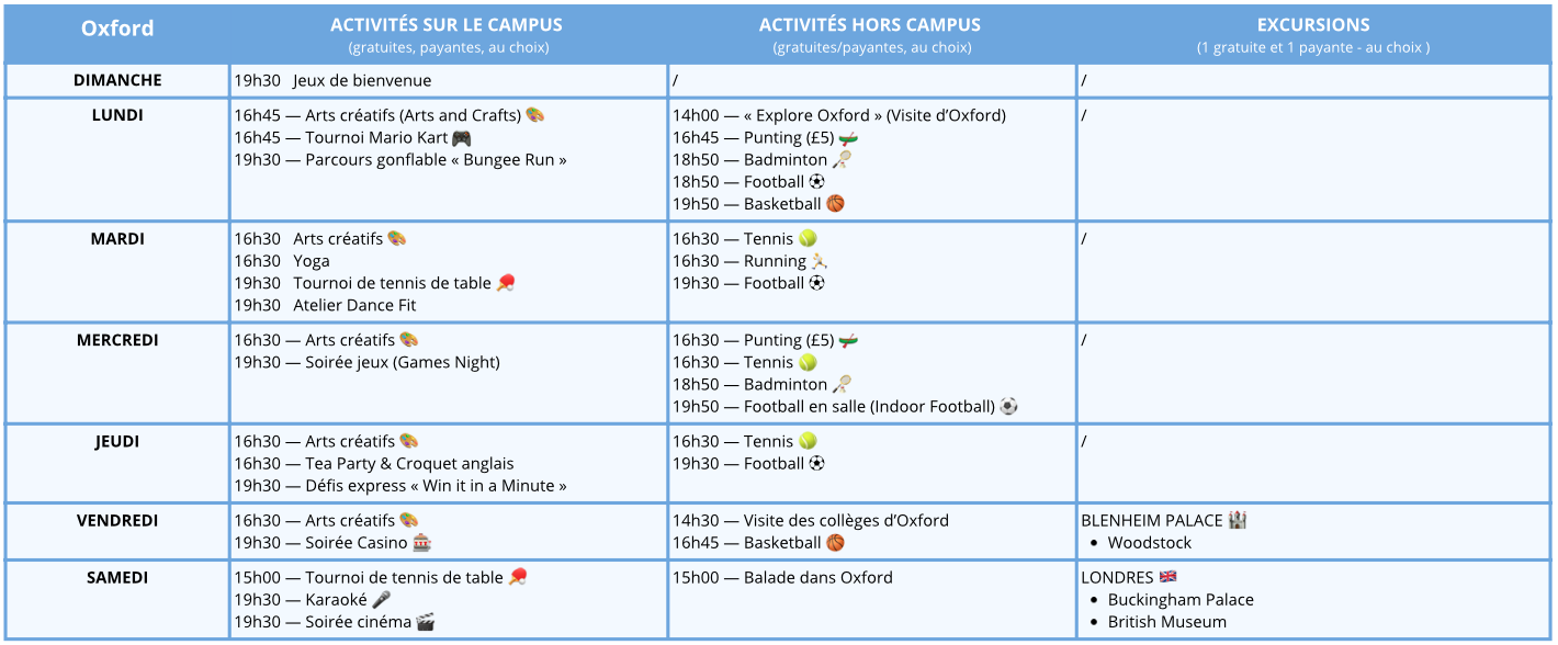 Des activités sportives, créatives et sociales sont proposées chaque jour. Une excursion à la journée par semaine est incluse, avec des destinations comme Londres, Bath, Cambridge ou Windsor. Des excursions supplémentaires peuvent être proposées en option.