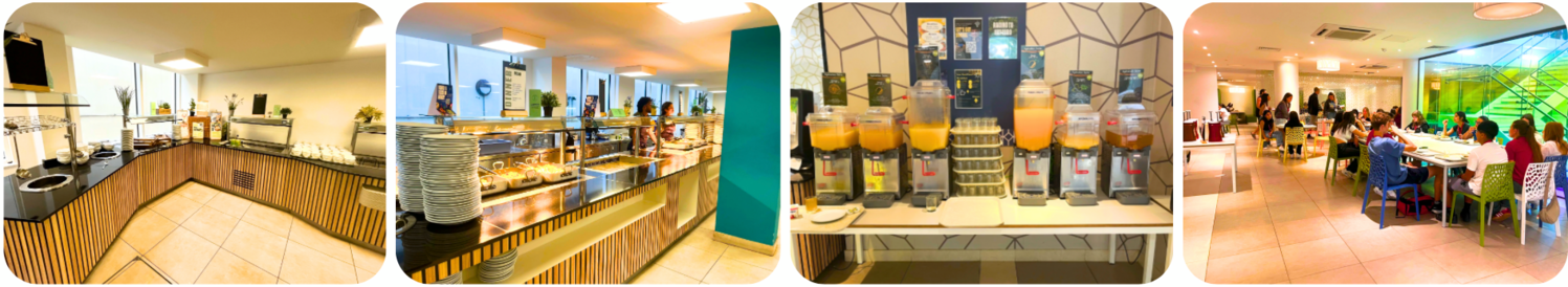 Chaque matin à partir de 7h30, les jeunes profitent d’un buffet en libre-service au Garden Halls : viennoiseries, croissants jambon-fromage, buns bacon-œuf, toasts, yaourts, céréales, fruits et jus.