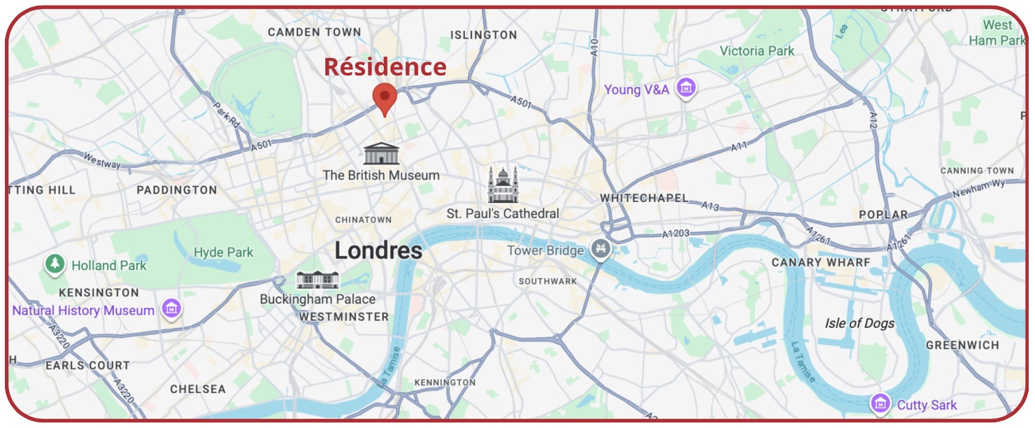 Le logement se fera en résidence. La résidence est située à quelques minutes à pied de la gare de King’s Cross, ce qui facilite l’accès aux différents sites de cours, d’activités et aux transports en commun pour découvrir Londres.