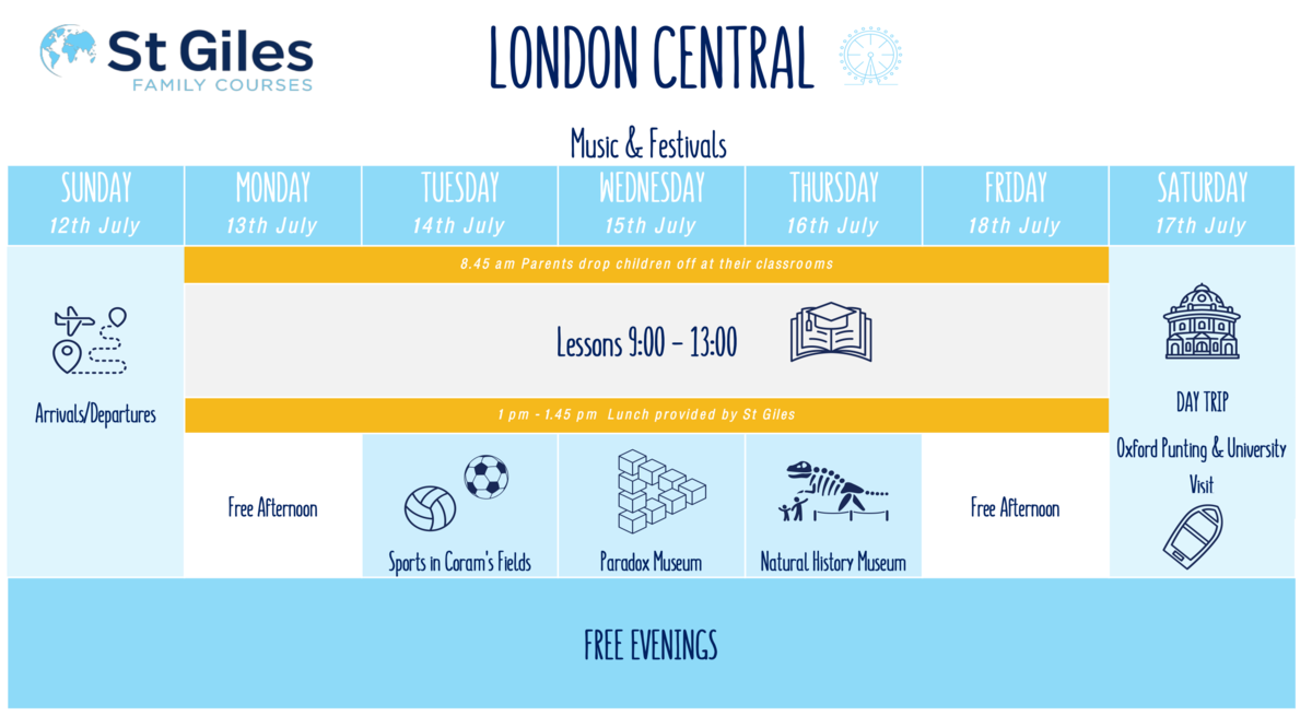 Les cours d’anglais pour parents et enfants, les déjeuners en semaine, le petit-déjeuner, les activités et une excursion par semaine, l’hébergement est en option