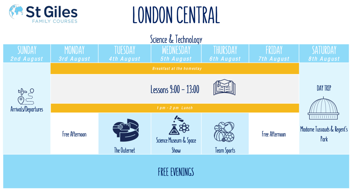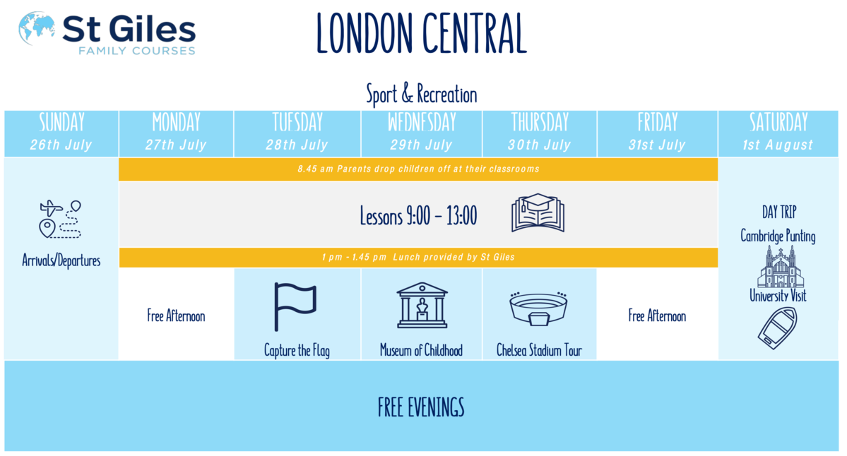 Le programme a lieu uniquement en été avec des arrivées et départs le week-end et des cours du lundi au vendredi