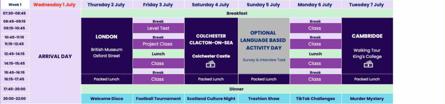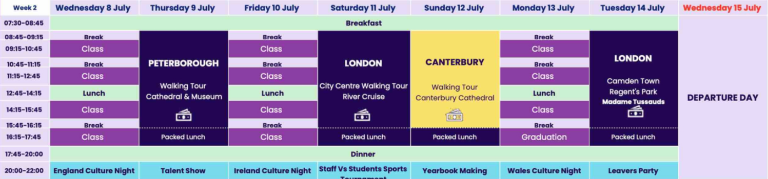| 14h15 | Journée Complète à LONDRES 🇬🇧 | Cours d'anglais | Journée Complète à COLCHESTER CLACTON-ON-SEA 🇬🇧 💶 | Journée d'activitées linguistique (optionnel) | Cours d'anglais | Journée Complète à CAMBRIDGE 🇬🇧 💶 | |