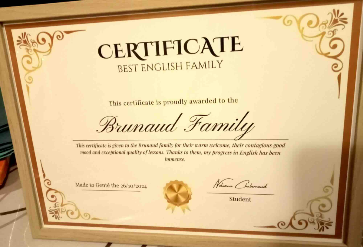 Famille accueillante qui sait être à l'écoute des jeunes pendant les cours ainsi que pendant les activités. Les activités comme les repas sont choisis en fonctions de nos préférences ce qui permet de passer un excellent séjours. Le niveau d'anglais est adapté en fonction de celui de chacun et rend la compréhension plus facile. Les cours sont en suivi du programme scolaire ce qui permet donc renforcer les connaissances.