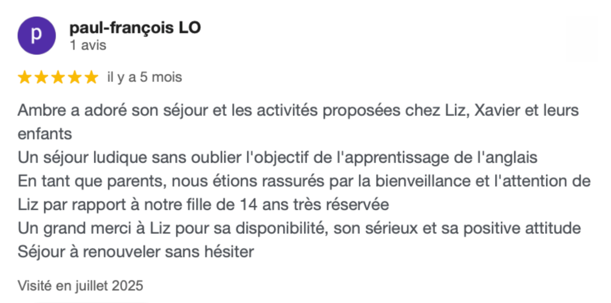 Famille excellente ! Une première pour Nolan 14ans, il a été ravis de ce séjour, Liz et Xavier sont à l'écoute, avec Nolan et avec moi. l'entente avec les enfants est parfaite. Le contact est facile, le niveau d'anglais a été apprécié par Nolan qui a enrichis son vocabulaire et sa compréhension. Les nombreuses activités proposées par Liz et Xavier permettent aux enfants de joindre l'utile à l'agréable. Nous sommes informé chaque jour des activités faites avec quelques photos et bilan de mi et fin de séjour. Nolan était assez ému de quitter la famille au bout de seulement 1 semaine tant il a été bien accueilli. Je recommande sans hésitation Liz et Xavier pour d'autres enfants. Un grand merci encore à eux pour leur investissement.