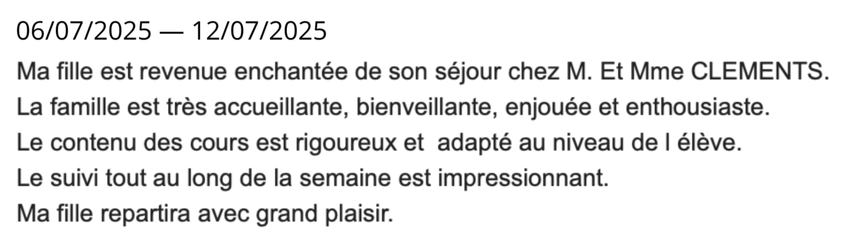Si je pouvais rajouter des étoiles je le ferai. Le séjour chez les Cléments est toujours un plaisir pour nos enfants, la famille est géniale et accueillante. Tous les membres de cette heureuse famille s'engage à rendre le séjour des élèves le plus agréable possible. Les cours peuvent être individualisés selon les points à aborder, le travail en petit groupe est propice aux échanges. Les élèves prennent vite confiance et se lâchent sans crainte. En dehors des cours, les activités proposées sont variées et rencontrent un grand succès. Les enfants disposent d'un grand jardin pour s'adonner à des activités extérieures. Je recommande cette famille.