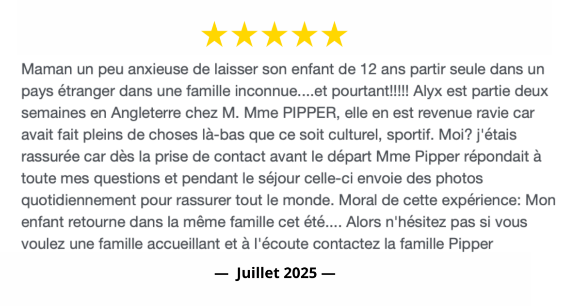 La famille Piper a été incroyable avec ma fille Juliette ! Grande gentillesse, hospitalité et très bons enseignements en anglais. De nombreuses visites complémentaires ont fait de ce séjour, un séjour inoubliable. Un grand GRAND merci à Sue !