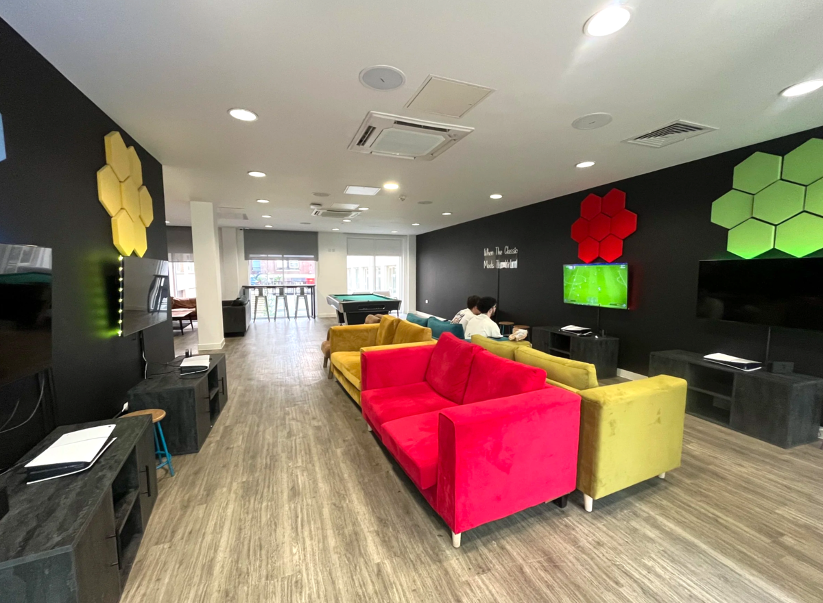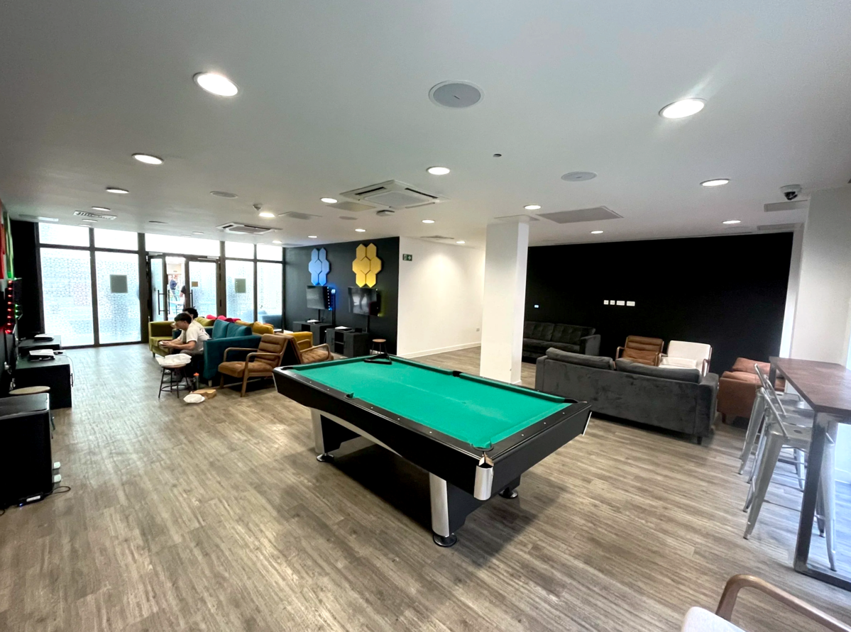 Les espaces communs, régulièrement nettoyés, comprennent des salons, des salles de détente et de socialisation ainsi qu’une salle de jeux ou un espace TV.