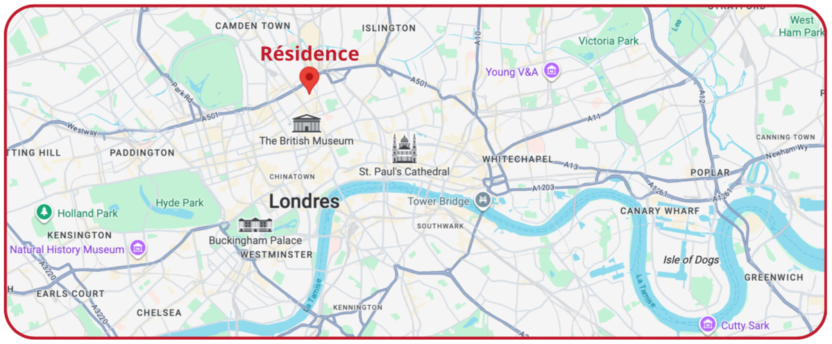 Le logement se fera en résidence. La résidence est située à quelques minutes à pied de la gare de King’s Cross, ce qui facilite l’accès aux différents sites de cours, d’activités et aux transports en commun pour découvrir Londres.