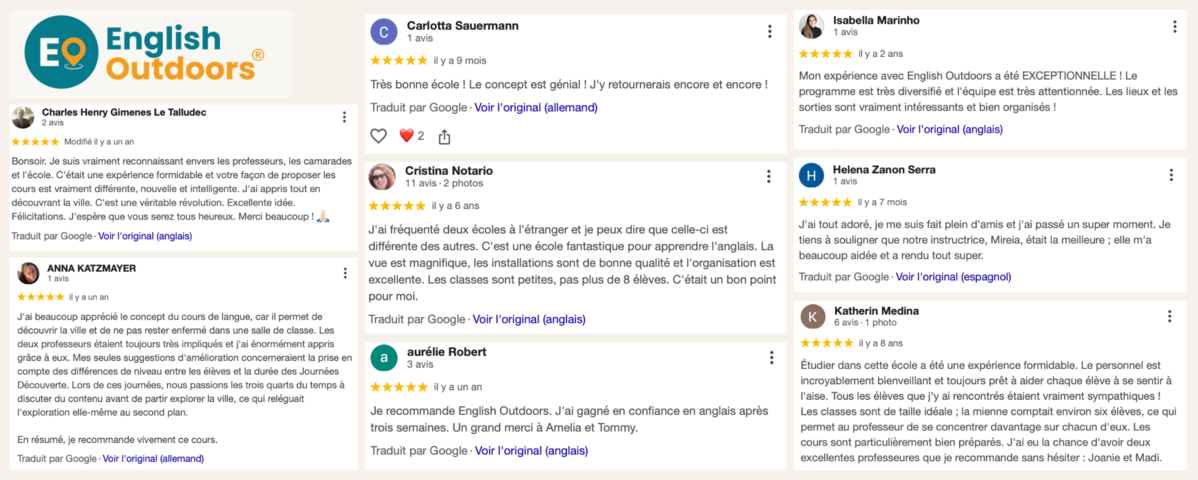Avec English Outdoors, la ville elle-même est ton terrain d’apprentissage. L'approche combine anglais + tourisme pour te plonger dans un anglais vivant, naturel, au cœur de l’action.
